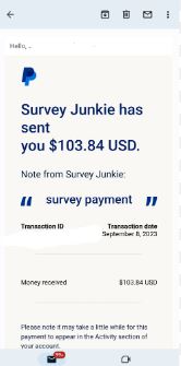 I make $103 PayPal Cash weekly, taking surveys on SurveyJunkie. Below is a screenshot of a PayPal payment I received from them: